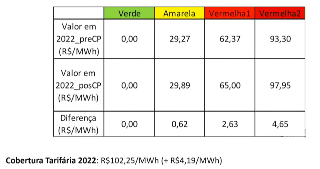 Já a bandeira amarela passa a incidir R$ 2,989 para cada 100 kWh consumidos no mês, enquanto a vermelha patamar 1 foi atualizada para R$ 6,50 e a patamar 2 para R$ 9,795. O recálculo retorna à metodologia seguida pelas bandeiras desde 2016, na qual a vermelha patamar 2 cobre 95% dos eventos históricos conhecidos e não 100% como no segundo semestre de 2021.