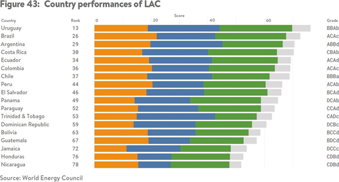 Considerando somente países da América Latina e Caribe, o Brasil está na segunda posição, atrás do Uruguai. No entanto o documento alerta para a necessidade de aprimorar a segurança energética e a sustentabilidade ambiental do país. Destaca também a necessidade de esforços contínuos para diversificar o mix de energia, e tentar reduzir a dependência das matrizes fósseis, investindo mais em eólicas e solar, que atraem cada vez mais o interesse de investidores.