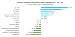 A CCEE monitora 15 áreas da economia que compram energia no mercado livre. Em relação ao mesmo período do ano passado e desconsiderando a migração de cargas, as maiores altas foram registradas nos setores de serviços (22%), bebidas (17%) e transporte (9%).