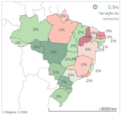 Entre as regiões, o Mato Grosso registrou o maior avanço no consumo de energia elétrica, de 9% no comparativo anual, seguido por Rondônia (8%) e Paraná (7%). Os maiores recuos foram no Piauí (-5%), Rio Grande do Norte e Paraíba, ambos com demanda 3% menor. Segundo a CCEE, os fatores climáticos foram os que mais motivaram as variações nos estados, destacando aqueles que registraram maiores temperaturas e menores volumes de chuva do que no ano passado.