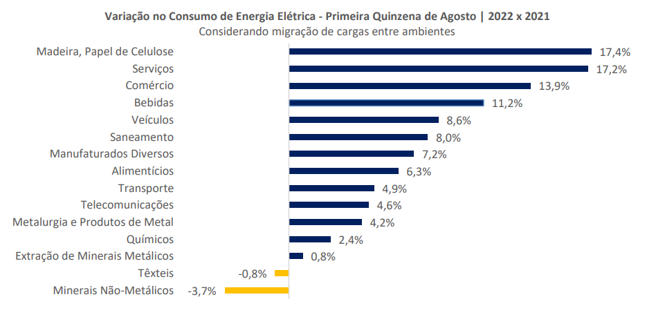 A Câmara de Comercialização monitora o consumo de energia elétrica em 15 ramos de atividade econômica e quase todos eles tiveram demanda maior no início de agosto em relação a 2021, conforme o gráfico a seguir.