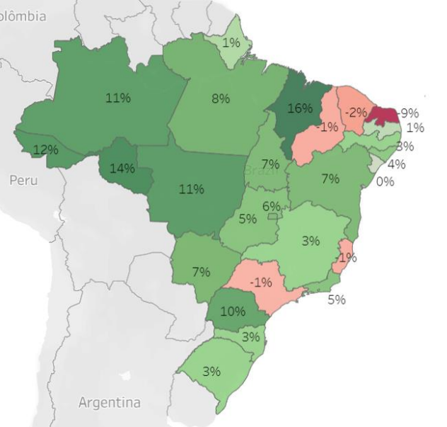 O Maranhão liderou a lista dos estados com a maior alta, de 16%, seguido por Rondônia e Acre, com 14% e 12%. Entre os recuos, temperaturas mais amenas do que as registradas na primeira quinzena de agosto do ano passado reduziram a demanda em 9% no Rio Grande do Norte e 2% no Ceará. Já São Paulo, Espírito Santo e Piauí tiveram um pequeno declínio, de 1% cada um.