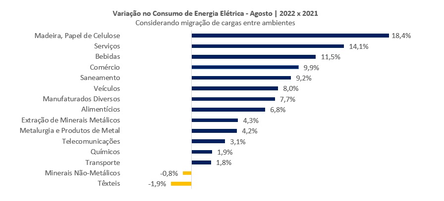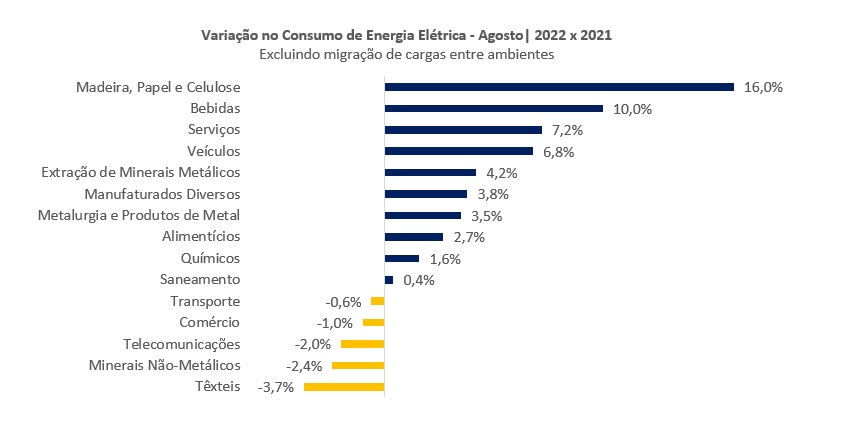 A Câmara de Comercialização também realiza o monitoramento do consumo de energia em 15 setores da economia que compram seu fornecimento no mercado livre. Em agosto, no comparativo anual e desconsiderando a migração de cargas, os maiores avanços foram registrados pelos ramos de Madeira, Papel e Celulose (16%), seguido por Bebidas (10%) e Serviços (7,2%). Cinco ramos tiveram queda, com destaque para a indústria têxtil (-3,7%), Minerais Não-Metálicos (-2,4%) e Telecomunicações (-2%).