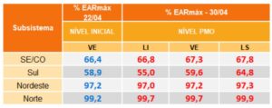 Os reservatórios seguem com bons níveis. No Sudeste/ Centro-Oeste, o volume deve ficar em 67,3% ao fim do mês. Na região Nordeste, o armazenamento estimado para abril é de 97,2%, enquanto no Norte a expectativa é de 99,7% . A região Sul segue em curva de recuperação, com previsão de níveis em 59,6%.